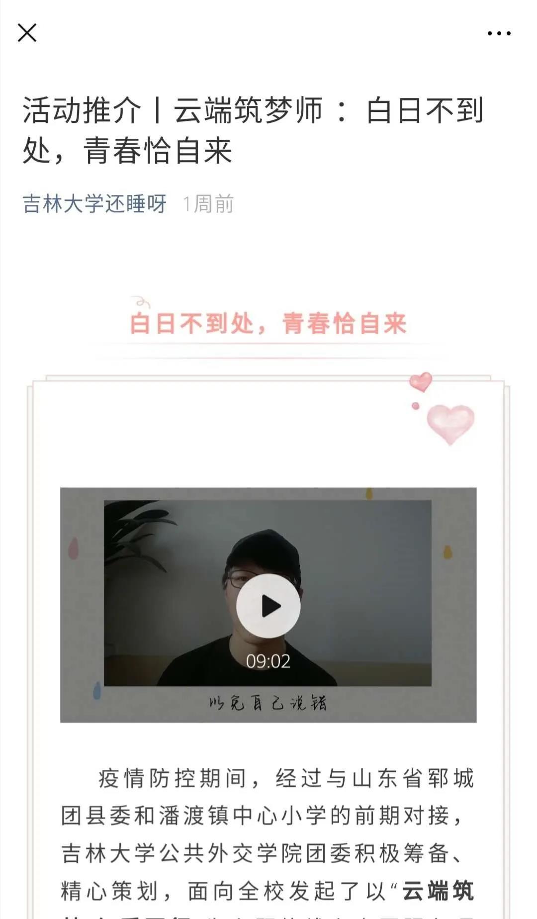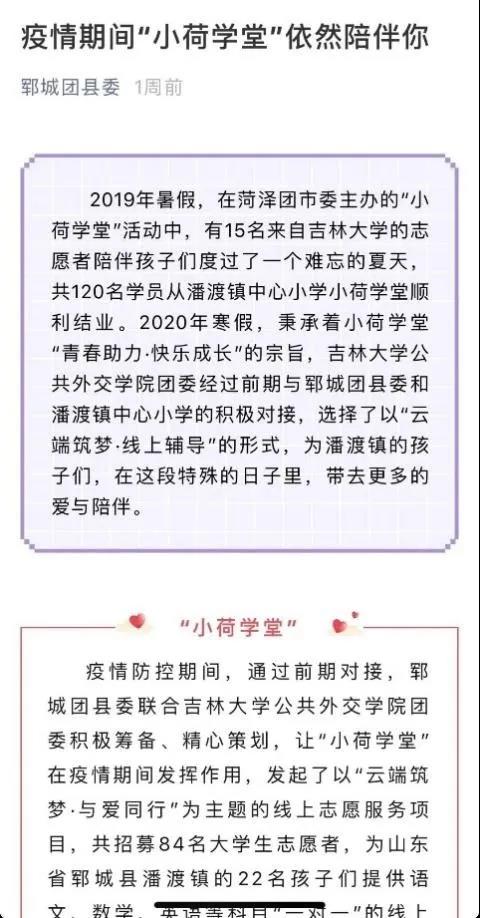 2020年,突如其来的新冠肺炎疫情打乱了人们生产生活的节奏。秉承着“青春助力·快乐成长”的宗旨,经过前期与山东省郓城团县委、山东省郓城县潘渡镇中心小学和吉林省安图县桃园村的对接与筹备,必威团委以学院支教队为依托,率先在全校范围内组织开展“云端筑梦·与爱同行”线上志愿服务项目,在这段特殊的日子里,为两地的孩子们带去更多的爱与陪伴。