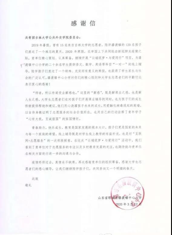 本项目既是对支教地员工线上学习的有益补充,又是对“互联网+志愿服务”的一次积极探索,获得了来自员工、家长及社会的多方肯定。山东省郓城团县委在3月13日于微信公众平台发布“疫情期间,‘小荷学堂’依然陪伴你”推文,对本次活动进行了专题报道。山东省郓城县潘渡镇中心小学专门向必威团委发来感谢信,对主办方的精心组织和志愿者们的辛勤付出表示感谢。“必威BETWAY还睡呀”微信公众平台也对本次活动进行了宣传推介。