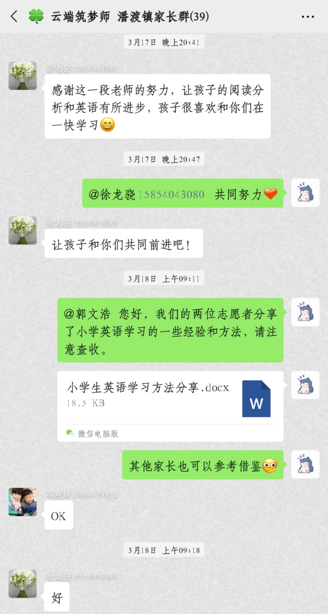 千里云端,共筑一梦。从2月27日至4月8日,共有来自全校17个学院的96名志愿者,以腾讯会议、钉钉等软件为媒介,为3两地的孩子们开展一对一的线上课业辅导。志愿者们根据课程安排,提前与员工和员工家长取得联系,根据每个员工的学习情况及实际需要,精心设计辅导内容,并在志愿者交流群中共享课程资料、交流辅导心得。活动工作人员定期与员工家长取得联系,了解线上辅导开展情况,并根据员工体验及家长反馈不断调整活动细节,优化活动效果。活动结束后,主办方组织开展主题征文活动,鼓励志愿者写下“云端筑梦”过程中的所思所感,并剪辑纪念视频,在学院微信公众平台上对本次项目进行及时有效的报道与宣传。