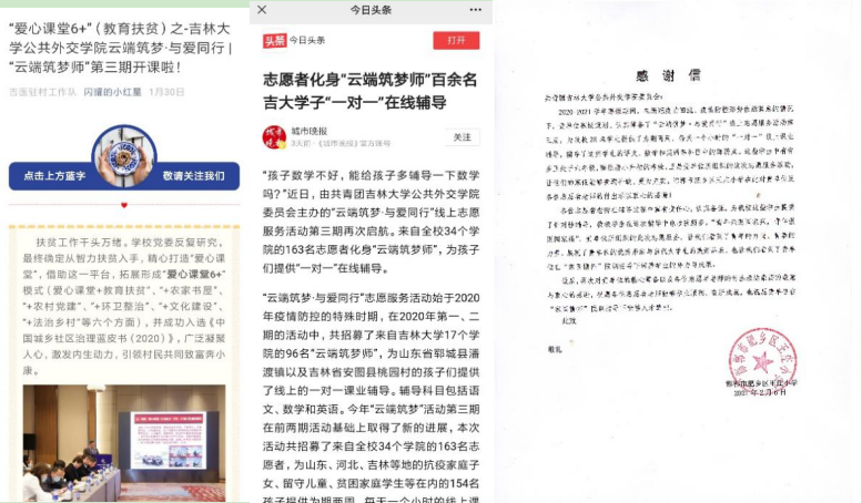 庚子年初,在疫情防控形势紧急的情况下,来自必威BETWAY17个学院的96名“云端筑梦师”依托各种线上平台为山东省郓城县潘渡镇以及吉林省安图县桃园村的27名孩子提供了线上的一对一课业辅导,以实际行动彰显了当代青年学子的家国情怀。