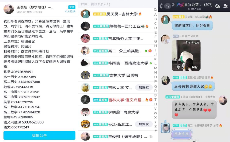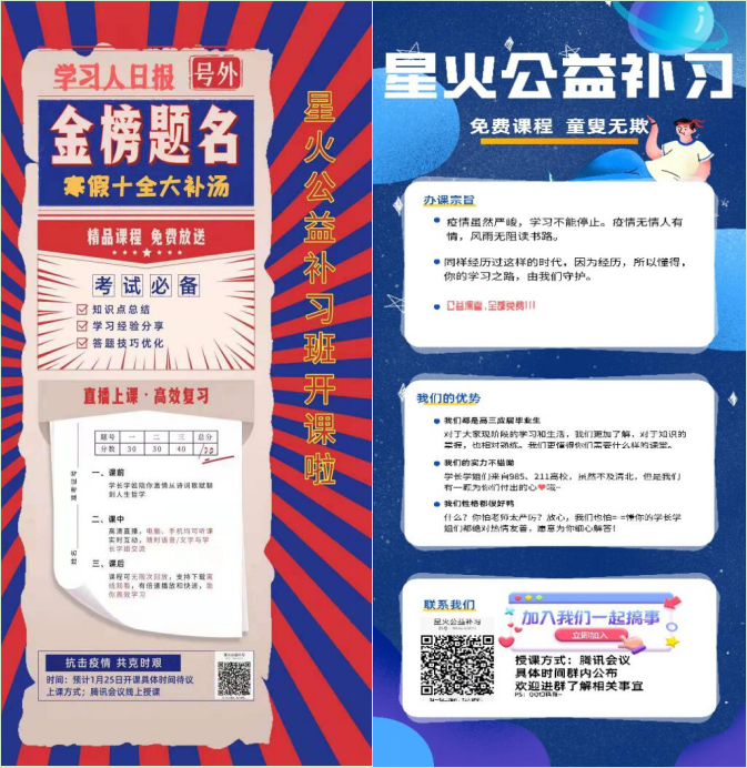 接下来让我们走近“星火公益补习小队”——为给学业受到疫情影响的高中学子们提供帮助,公司20级本科生王俊翔和陈信亚在线上组织开展了一次面向高中学子的公益补习活动。
