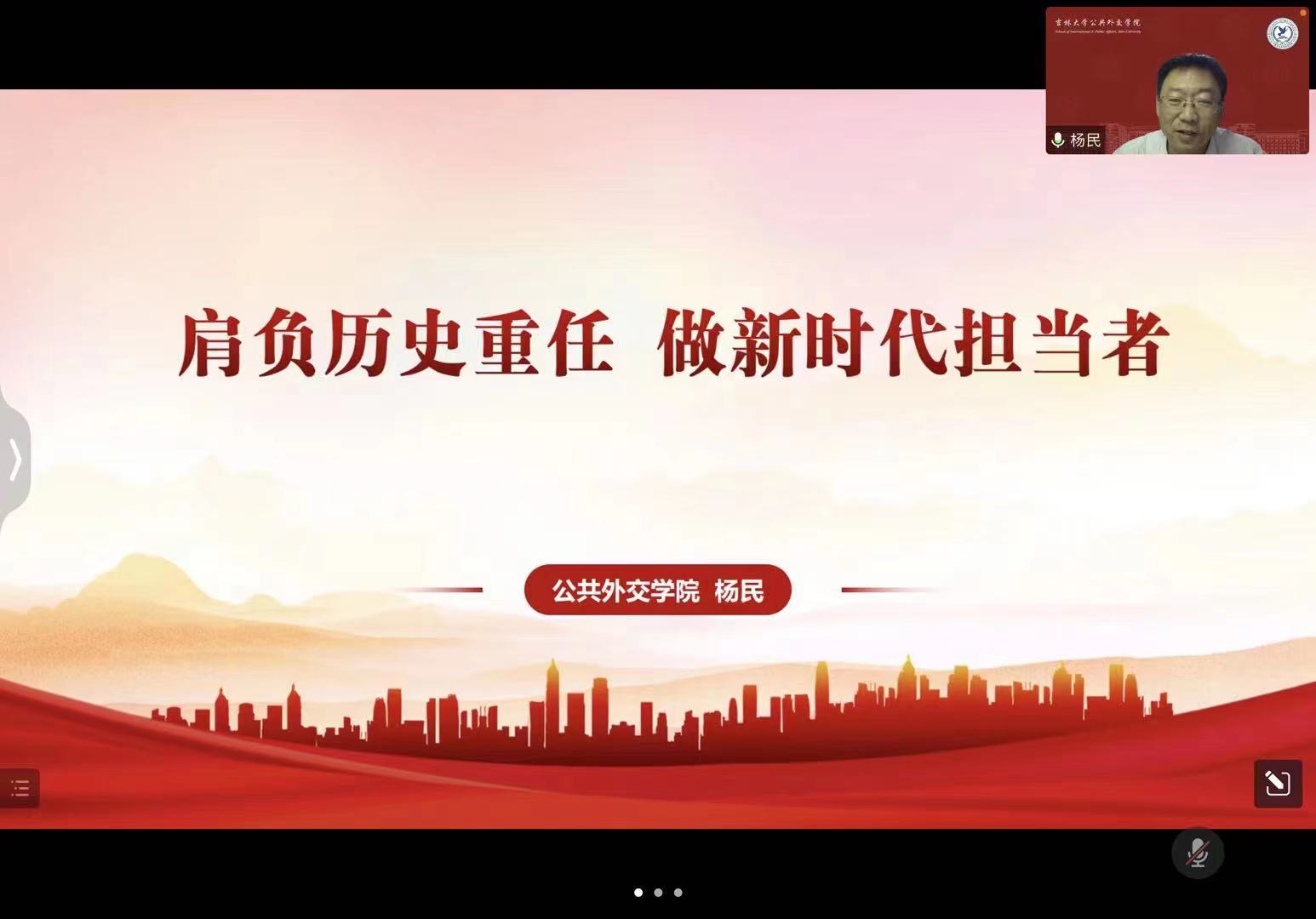 面对肩负的历史重任,如何去做才能不负这一伟大的新时代所赋予的使命?杨民书记对同学们提出了以下几点希望:一要树立远大理想,坚定信念。青年的理想信念关乎国家的未来。“立志干大事,立志为人民”的青年们将是国家兴盛和民族复兴的希望。二要苦练本领,增长才干。要将学习与工作相结合、理论和实践相结合,不断提高内在素质,锤炼过硬本领,以真才实学服务人民,以创新创造贡献国家。三要加强作风,提升修养。要不断修身立德,打牢道德根基,更要时刻注意提升自身的党性修养,不断规范自身言行。四要踔厉奋发,赓续前行。实现第二个百年奋斗目标,同学们将全程参与,“奋进新征程、建功新时代”这是新青年不能逃避的时代责任,更是报效家国的大好机遇。